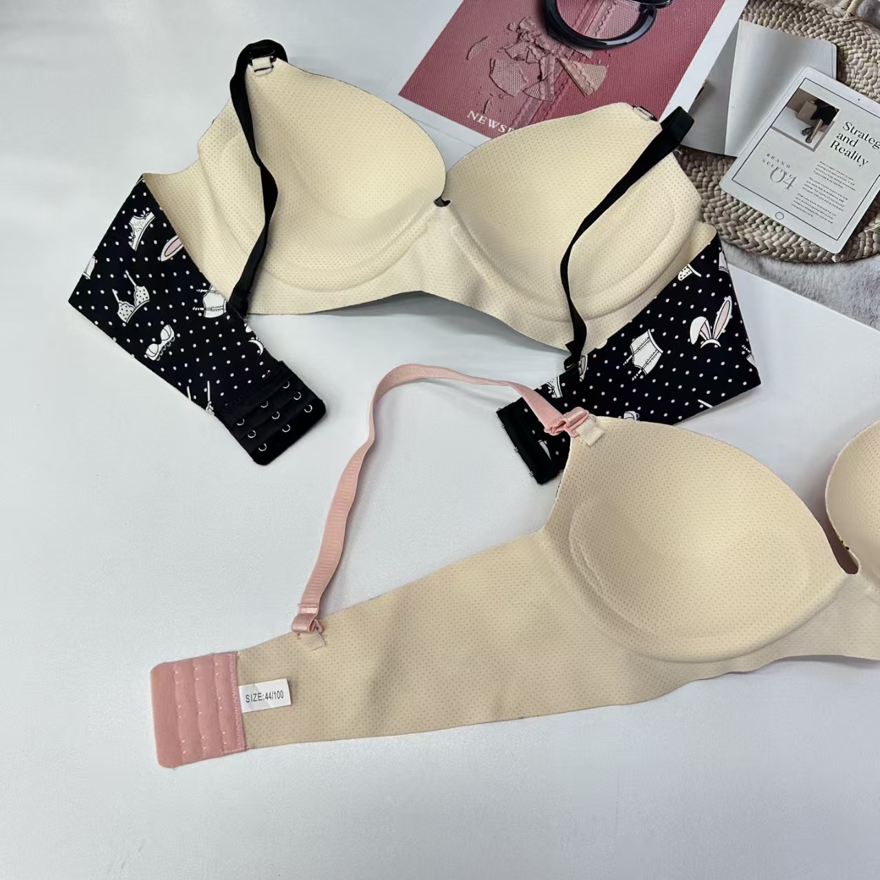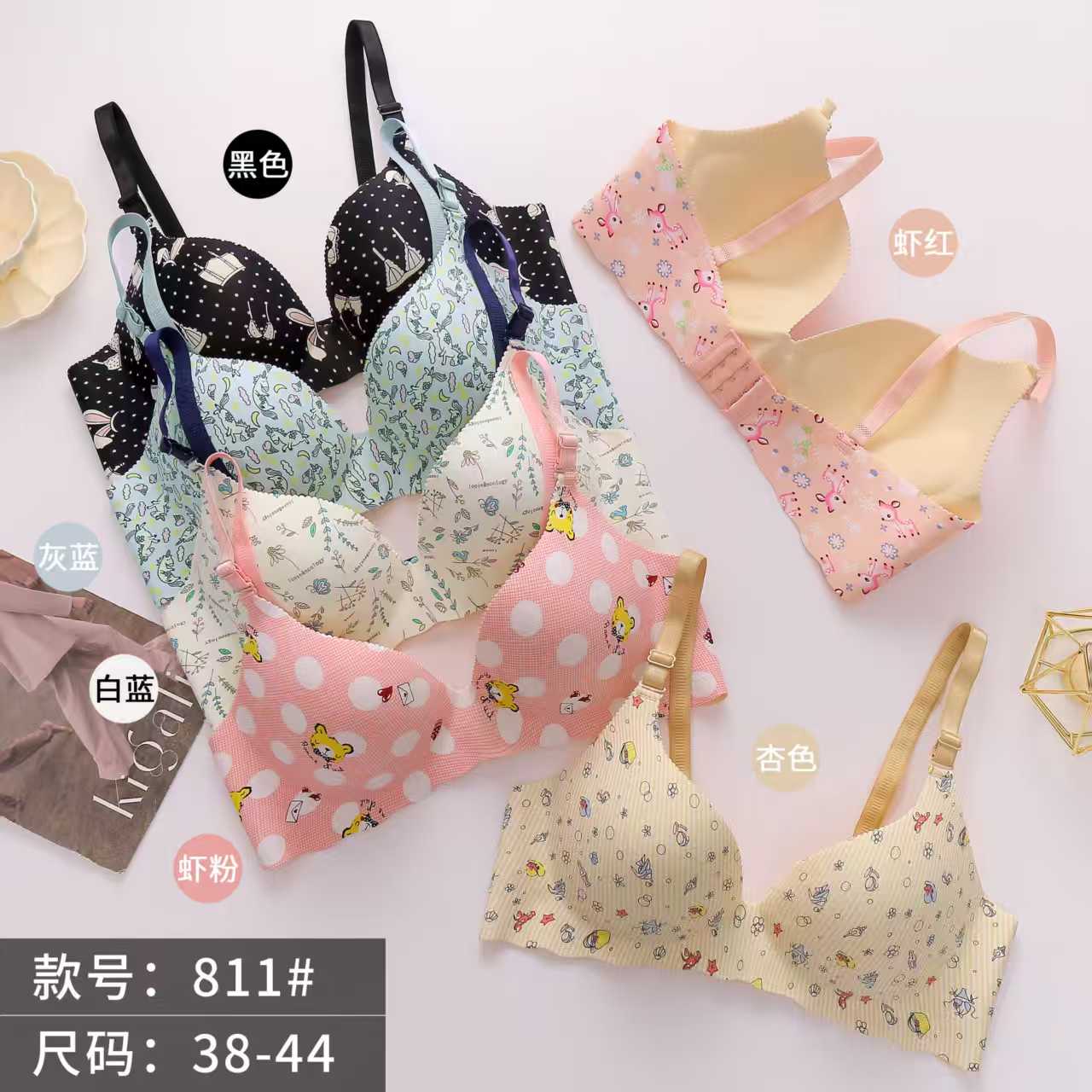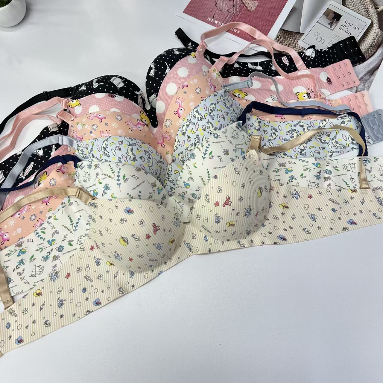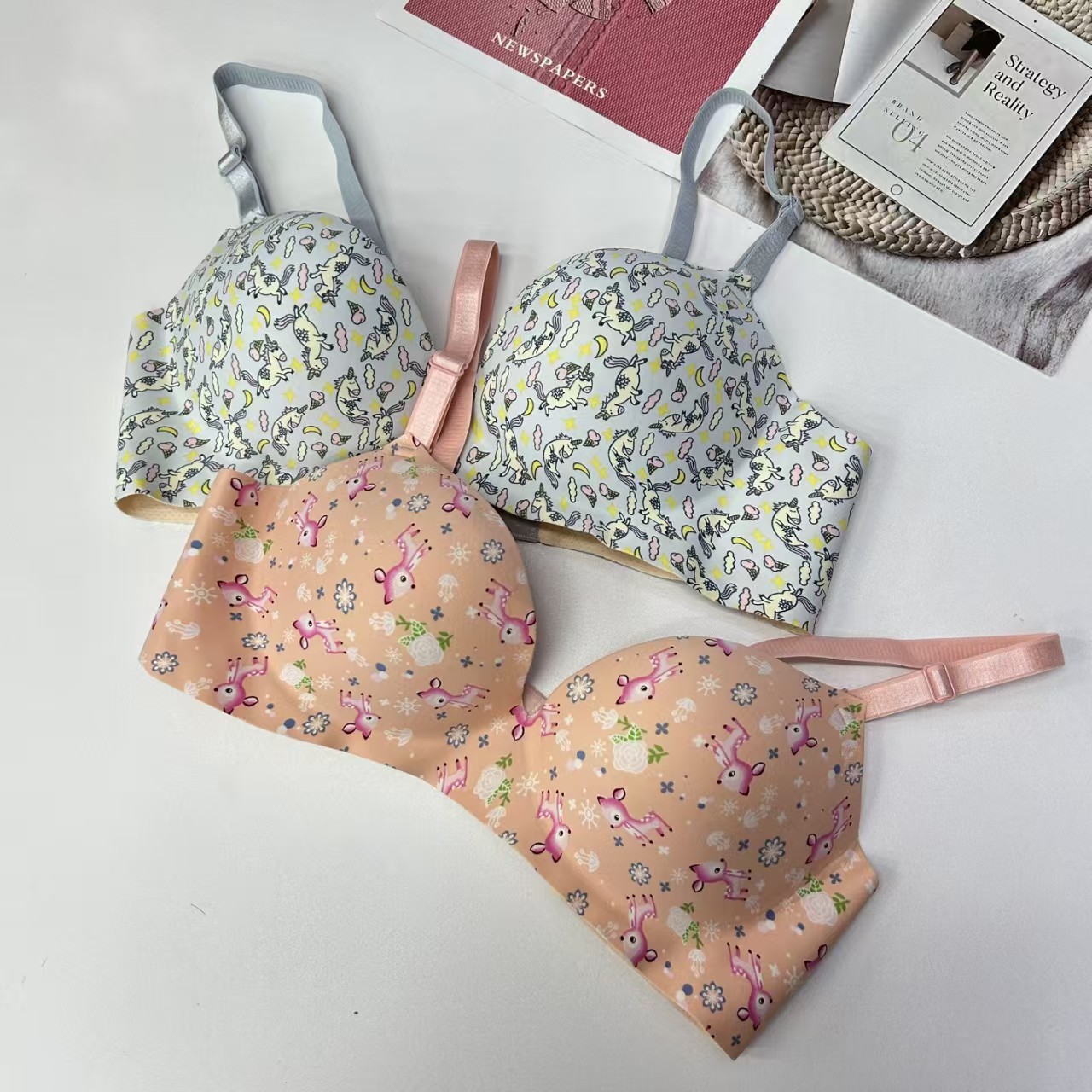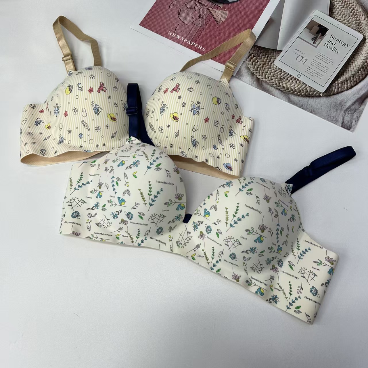 外贸出口文胸女士一片式无钢圈文胸印花少女文胸上托聚拢调整型文胸