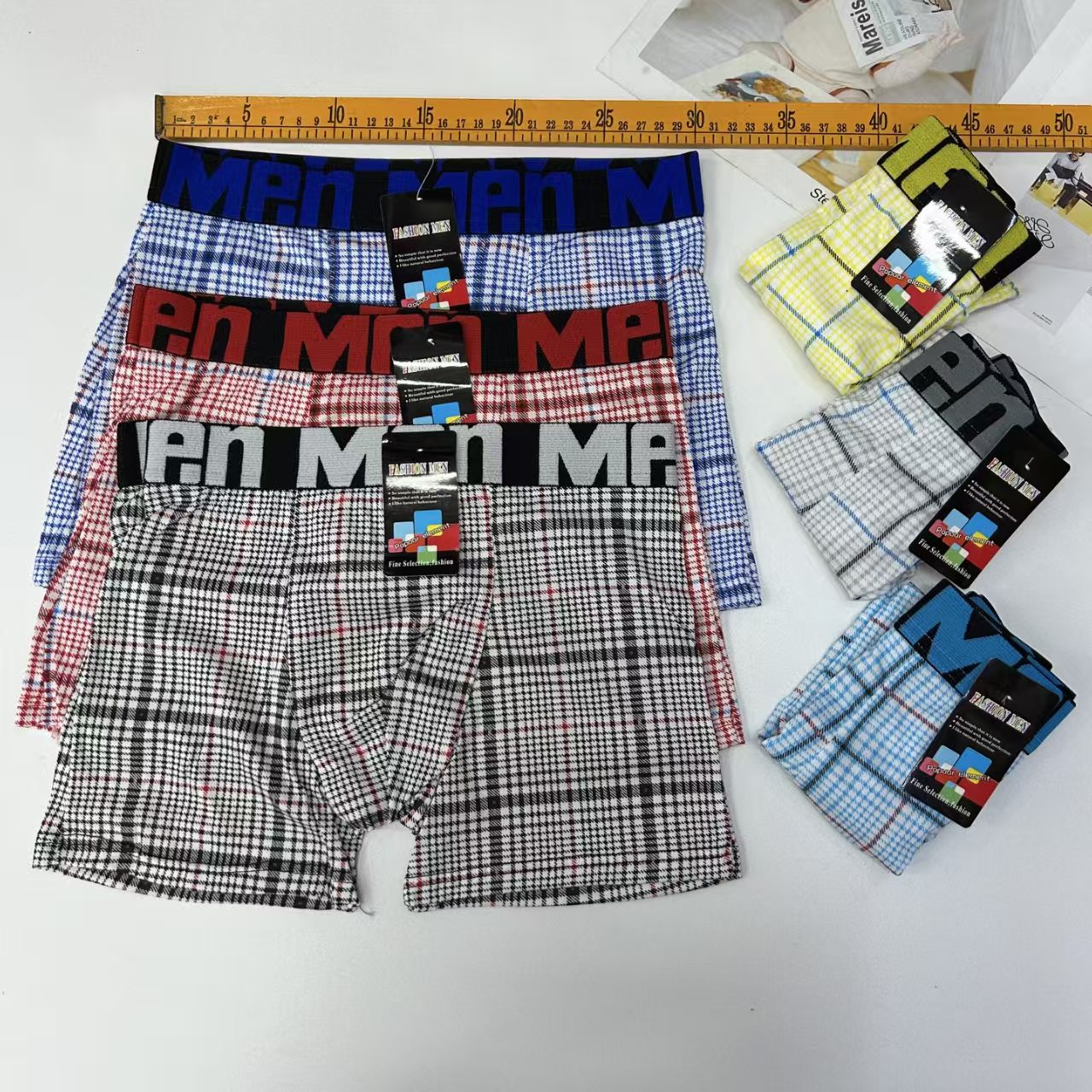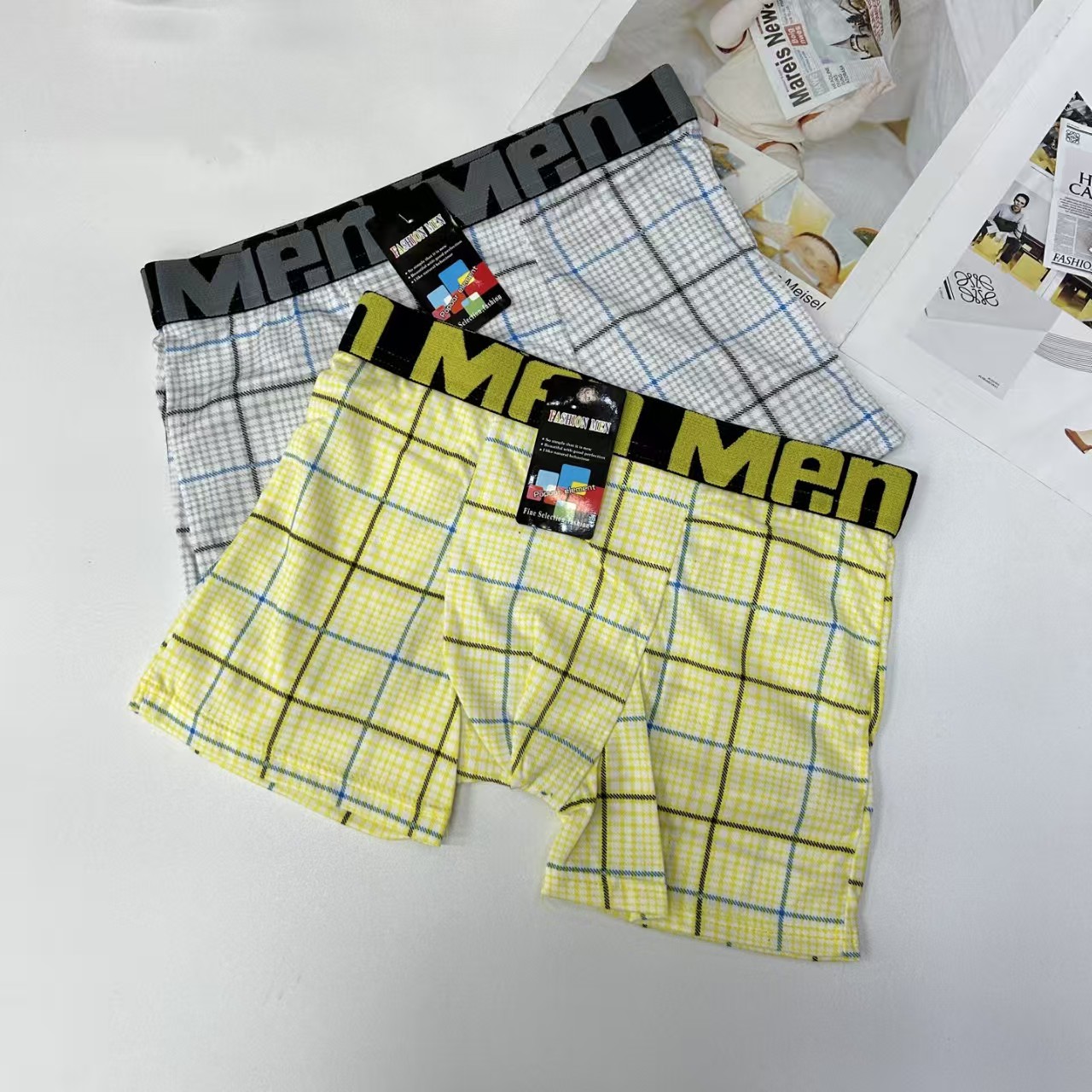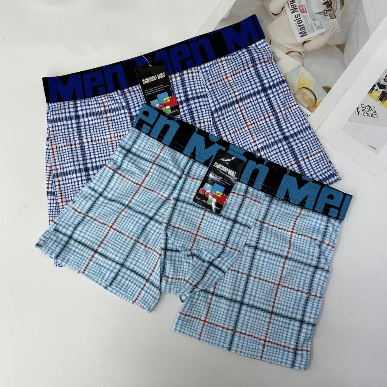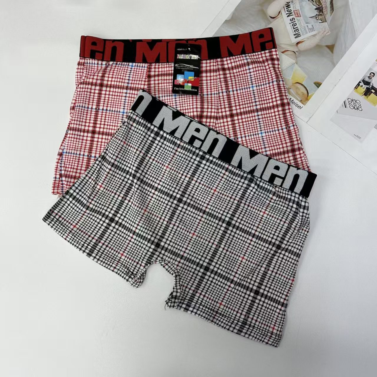 外贸出口男士内裤男士网格撞色条纹印花内裤提花腰头男士平角裤